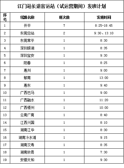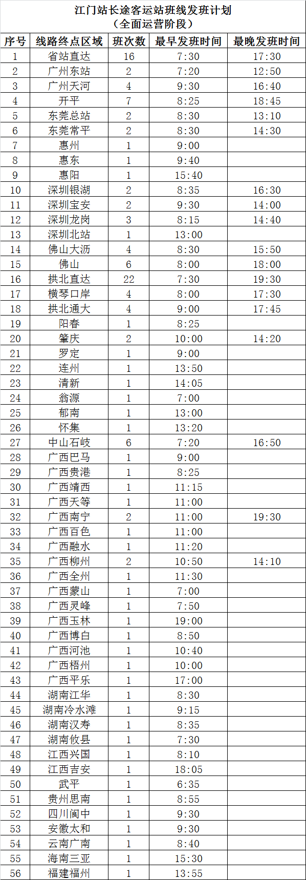 长途客运站全面投入运营后进站线路多达56条,其中省际线路29条、市际线路26条、县际线路1条,计划日发130班次,发班时间为07:00—19:30。 待江门站轨道交通线路稳定后,将根据客源及班次的情况调整优化客运班线线路、班次,并计划增开直达我市各大旅游景点的班车。 (具体运营班次请滚动手机屏幕到文章下方)