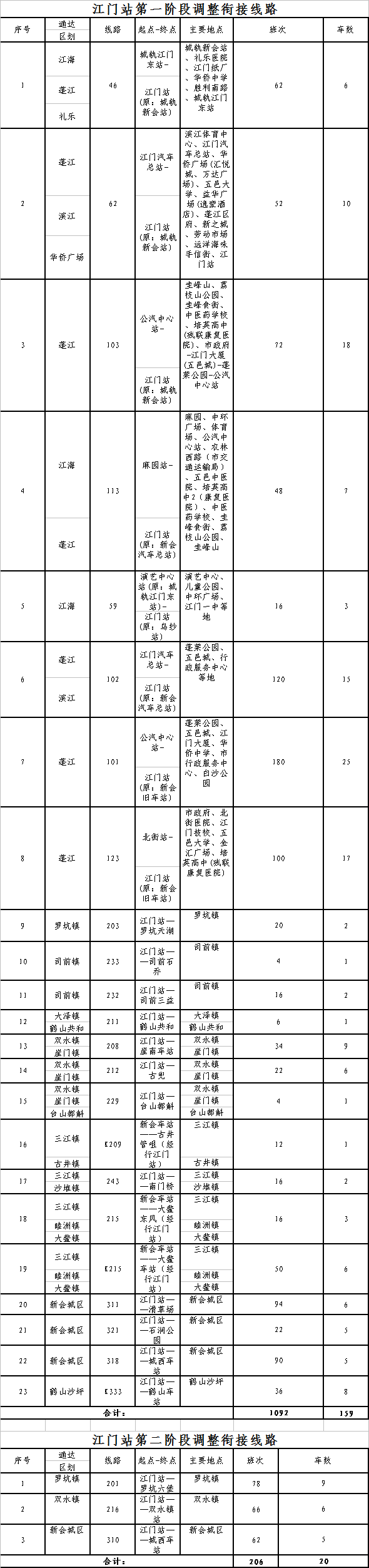 江门站开通后,公交站场公交线路计划开通26条,将同步分两阶段实施: 第一阶段 江门站启用后同步调整23条公交线路衔接江门站,日均1092班次; 第二阶段 根据江门站轨道交通经停班次或实际客流需要,开通余下3条公交线路,日均增加206班次。 相关线路基本可覆盖蓬江、江海、新会区主城区、新会区各行政镇以及台山市、鹤山市部分乡镇,后续将根据客流情况优化和增加公交线路。 (具体运营班次请滚动手机屏幕到文章下方)