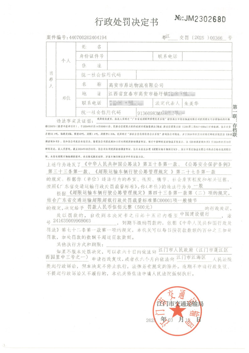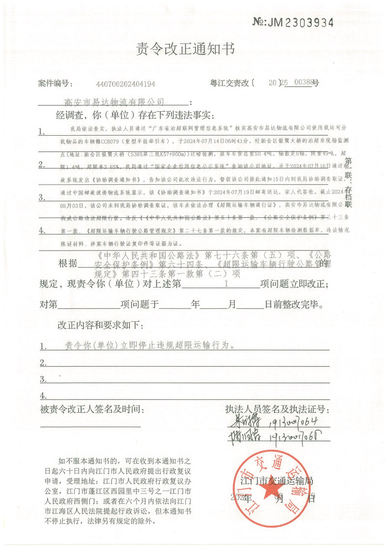 你(单位)因违反交通运输行政管理法规,本机关已作出行政处罚决定和责令改正通知书(具体内容详见附件)。依照《中华人民共和国民事诉讼法》第九十五条的规定,因受送达人采用其他方式无法送达,现向你(单位)公告送达《行政处罚决定书》和《责令改正通知书》。自公告之日起,经过30日即视为送达。