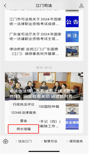 第一步:登录江门市司法局网站(http://www.jiangmen.gov.cn/bmpd/jmssfj/),进入右下角“局长信箱”栏目。