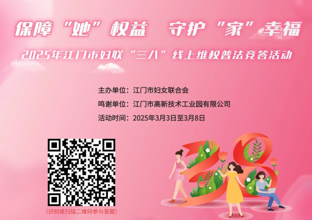 近期,为纪念“三八”国际妇女节115周年,推进妇女权益保障工作高质量发展,提升妇女群众依法维权意识,江门市各级各部门开展“三八”妇女节普法宣传活动,营造全社会尊重和保障妇女权益的良好氛围。