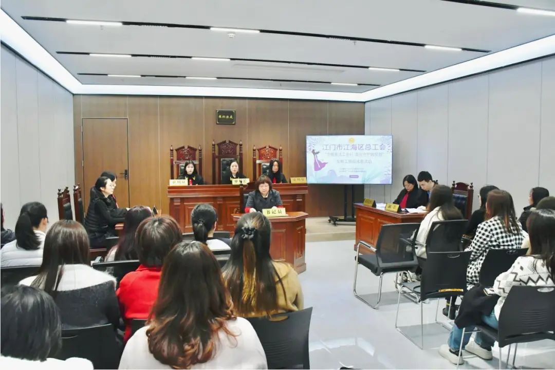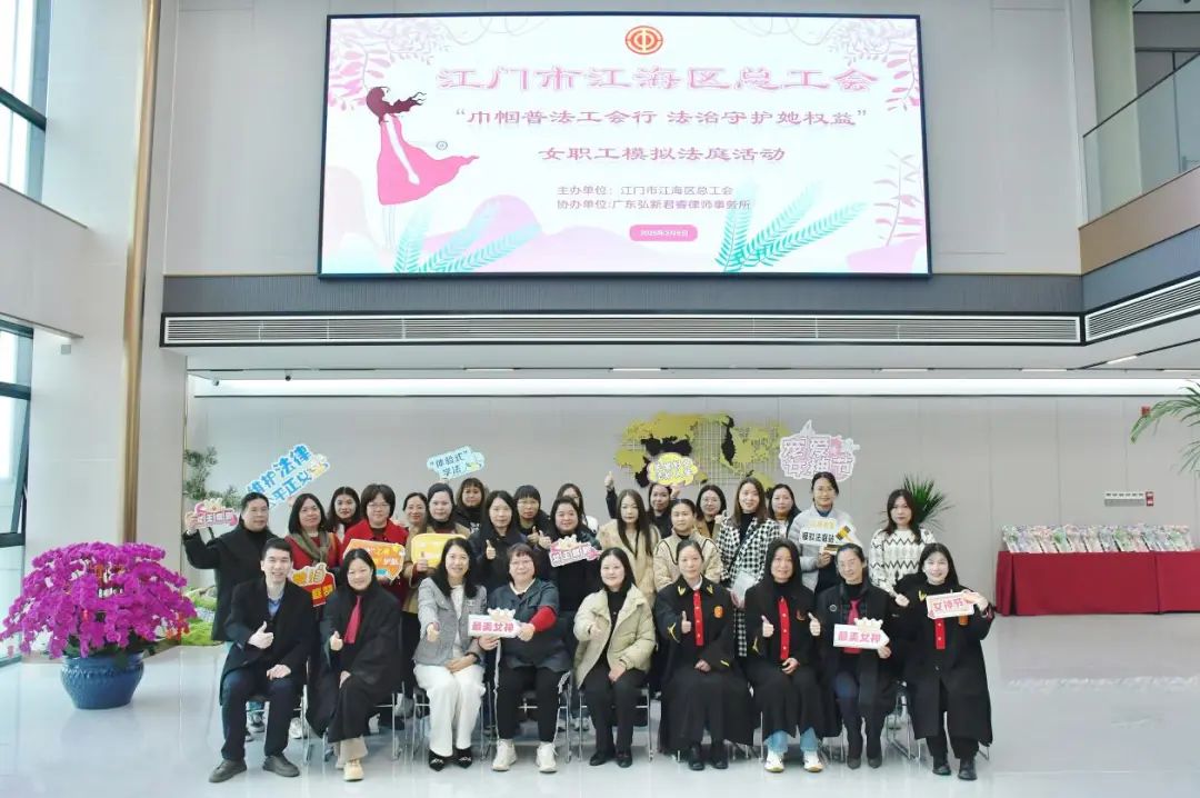 3月6日,江海区总工会、江海区司法局在广东弘新君睿律师事务所开展“巾帼普法工会行 法治守护她权益”模拟法庭活动,吸引约40名女性职工参加活动。现场通过模拟一件因家暴引起的离婚案件,生动展示了法律维权的全过程。随后,专业律师还进行了保护妇女权益专题普法讲座,深入解读了反家庭暴力法、妇女权益保障法等相关法律法规,并结合实际案例,讲解了如何运用法律武器维护自身合法权益,有效提升了女职工的法律素养,更为她们点亮了一盏温暖的法治“明灯”。