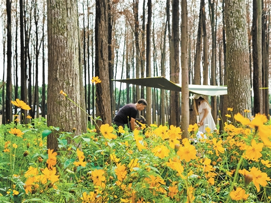 记者看到,有的游客装备齐全,在杉林里搭起简易帐篷和桌椅,摆上茶具,架起手机进行视频直播。游客陈先生向记者表示:“一边望着远处的西江,一边欣赏近处的花海。午后时分,和朋友悠闲地聊天喝茶,别有一番韵味。”