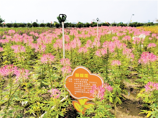 离洪字围不远处的东风岭南水乡生态园也是一片繁花似锦。平坦开阔的一片片格桑花田在蓝天白云映衬下,竞相开放,姹紫嫣红的花朵开得正艳。此外,这里的硫华菊、醉蝶花、向日葵等多种花卉也开得灿烂。花丛中还有稻草人、自行车等氛围道具,一派田园风光。这里不同的花卉都有清晰的文字介绍,也使得这里成为亲子春游的不二之选。
