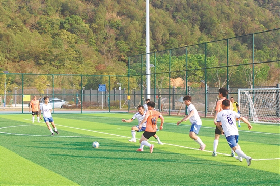 足球场上的球员精神抖擞,双方队伍互有攻防,为观众献上激情澎湃的草根足球盛宴。