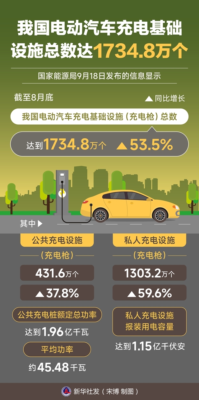 国家能源局9月18日发布的信息显示,截至8月底,我国电动汽车充电基础设施(充电枪)总数达到1734.8万个,同比增长53.5%。