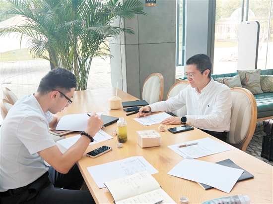 江海招商团队成员(左)与准备落地企业洽谈,指导企业修改相关材料。