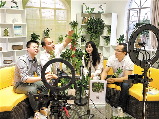台山市海宴镇五丰村驻村第一书记陈金灿(左二)通过直播带货帮助农户销售富贵竹。