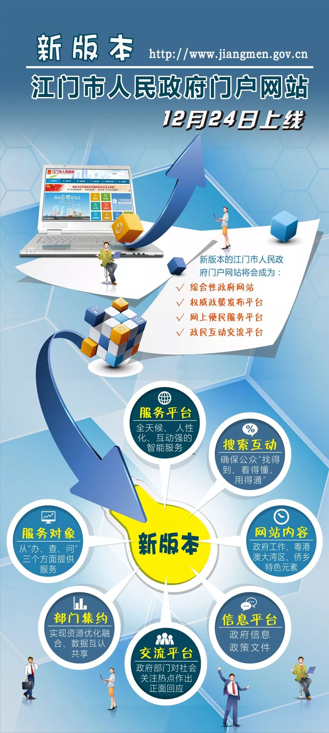 按照国家和省政府对政府网站建设管理的要求,本次改版主要围绕市委市政府的重点工作,结合国家各项政策措施和粤港澳大湾区经济圈发展规划,同时融入我市经济、旅游、侨乡等特色元素,对外展示江门侨乡的良好形象。实现“以人为本、协同高效、服务创新、先进职能”的智能化互联网服务平台,突出以用户为中心,提供各种公共服务,构建“全天候、人性化、多渠道、互动强”的网上政务服务平台。 我市作为省政府网站集约化工作试点地区,从今年4月份开始正式启动网站集约化工作,现已将市政府所有组成部门的网站变为部门频道http://www.jiangmen.gov.cn/newzwgk/zfjg/index.html集约统一到市政府门户网站中,有效实现资源优化融合、平台整合安全、数据互认共享、管理统筹规范、服务便捷高效。各政府部门将通过此平台集中发布主动公开的政府信息,及时发布新制定的政策文件,同步配套便于公众理解和互联网传播的解读产品,并转载对政策文件精神解读到位的媒体评论文章,形成传播合力。还可以通过互动交流平台,收集公众意见建议,对社会公众关注的热点问题,相关业务部门将作出正面、权威的回应。 改版后的江门市人民政府门户网站,可以根据个人、企业的服务对象不同,从“办、查、问”三个方面进行网站体验规划,推进政府网站向移动终端、自助终端、热线电话、政务新媒体等多渠道延伸。进一步增强智能搜索、智能互动等功能,确保公众“找得到、看得懂、用得通”。