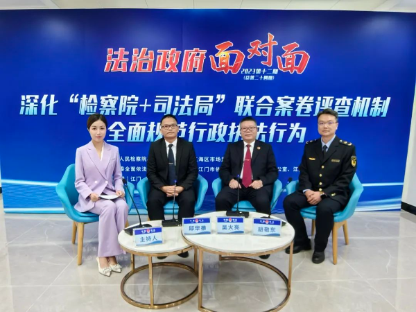 近日,由市委全面依法治市委员会办公室、市依法行政工作领导小组办公室、市普法办公室主办的第二十四期“法治政府面对面”专题访谈节目上线,江海区人民检察院、江海区司法局、江海区市场监督管理局做客节目,聚焦深化“检察院+司法局”联合案卷评查机制,全面规范行政执法行为主题,与群众面对面交流互动、共商法治。
