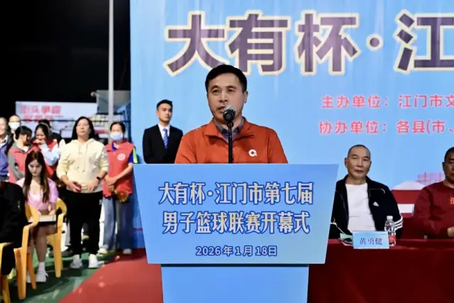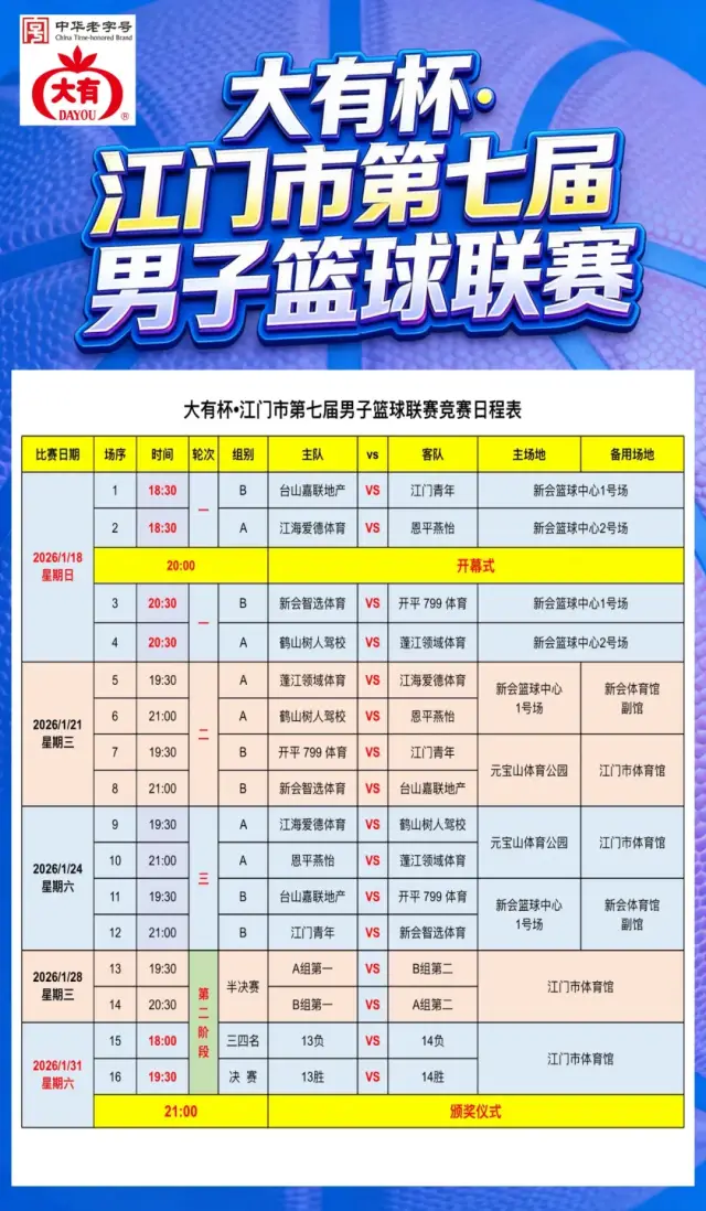 1月18日晚,大有杯•江门市第七届男子篮球联赛在新会篮球中心隆重开幕。首轮比赛精彩纷呈,火力全开,最终恩平、台山、蓬江、开平喜获开门红。本届比赛共有八支队伍参加,其中江门青年队只参赛不参与排名,旨在给年轻运动员一个高水平的锻炼平台,为江门篮球后备人才培育助力发展。另外来自四市三区的7支队伍均是以现籍户口为报名资格,各队伍认真组织了本地区最强阵容参加此次联赛,真正营造了为家乡而战,为家乡增光的良好氛围。