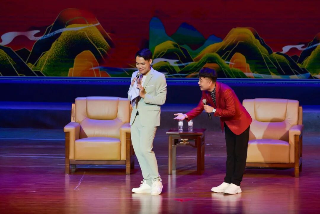 活动在现场访谈中拉开帷幕。黄俊英老师首先表示很高兴来到江门演出,并对江门城市建设的日新月异、城乡面貌的焕然一新赞叹不已;随后,他向观众分享了自己走上粤语相声表演之路的经历,并以《省港澳大比拼》等经典作品为例讲授粤语相声创演经验。黄老师认为:广府文化是中华文明的重要组成部分,粤语是广府文化的重要传承载体,而粤语相声的基础是粤语,是拥有广泛群众基础的艺术表演形式;但随着互联网快速普及、全新娱乐方式兴起,粤语相声发展日趋低迷,粤语相声作品更加要与时俱进,更好满足观众的审美需求和价值追求。黄老师最后强调:“一旦脱离社会,粤语相声就没有了生命力。”他的分享诙谐生动,妙语连珠,内涵深刻,引人深思。