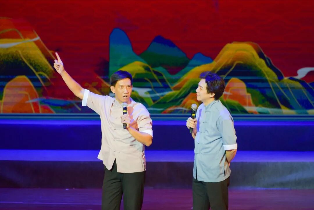 在演出环节,黄俊英老师的多位徒弟先后为侨乡观众表演了《爱情说》《保镖》等优秀粤语相声节目。这些作品以喜剧为载体,在看似荒诞不经的情节背后隐藏着对社会现象的微妙讽刺、对人性的深刻洞察和对生活的独特感悟,在逗乐之余引发观众的情感共鸣;而招俊龙、曾冠杰、张子龙、张绍锟等一众青年粤语相声演员也凭借纯熟的“说学逗唱”功夫塑造了一个个鲜活的角色、抖出了一个个“笑”果显著的包袱,赢得了观众的叫好和掌声。