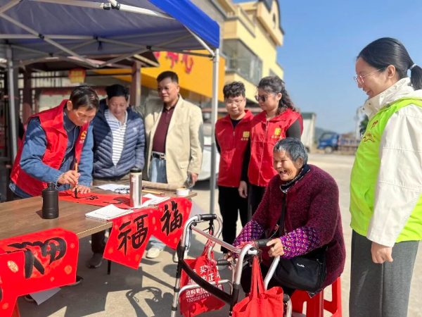 红彤彤的春联纸一字排开,墨香阵阵扑鼻而来。书法志愿者笔走龙蛇,将法治理念与新春祝福凝于笔端,村民们围在桌前,有的念叨着心仪的春联词句,有的捧着刚写好的春联满心欢喜,还有的主动向工作人员询问反诈知识。