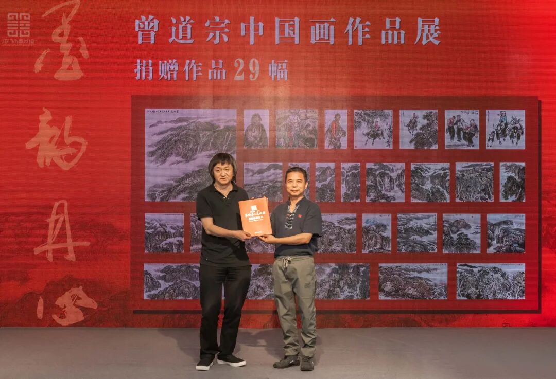 曾彤宇先生还代表家属向江门市美术馆捐赠多幅佳作,捐赠作品涵盖人物、山水两大题材,这些作品兼具笔墨韵味与时代感。江门市美术馆馆长王畅怀接受捐赠并颁发收藏证书。