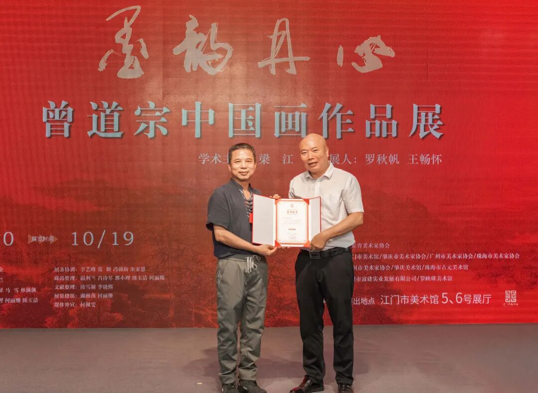 随后江门市美术馆馆长为罗秋帆先生颁发“江门市美术馆特殊贡献奖”荣誉证书,以此表彰其在本次展览筹备及美术馆典藏建设中的积极贡献。