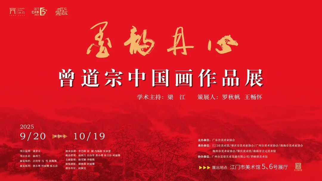 9月20日,由广东省美术家协会主办,江门市美术馆、肇庆市美术家协会、广州市美术家协会、珠海市美术家协会、梅州市美术家协会、肇庆美术馆、珠海市古元美术馆承办,广州市富建实业发展有限公司、罗映球美术馆协办的“墨韵丹心 —— 曾道宗中国画作品展”在江门市美术馆隆重开幕。本次展览作为2025 年第五届江门艺术季活动项目之一,系统呈现当代中国画名家曾道宗先生的艺术生涯成果,让侨乡市民有机会近距离感受中国画魅力。
