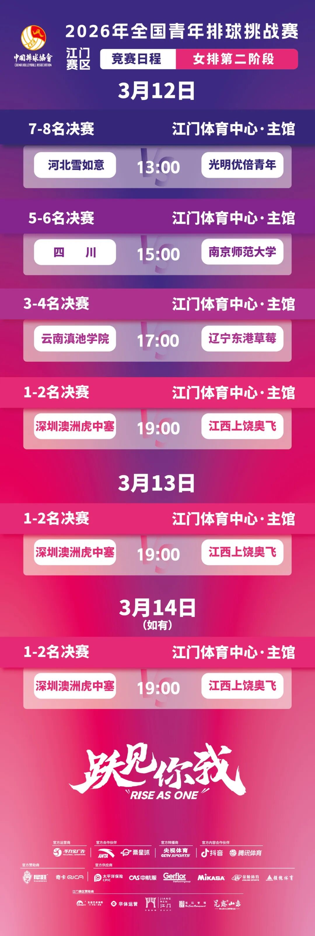 2026年全国青年排球挑战赛(江门赛区)于2026年3月4日至14日在江门体育中心体育馆举行。本次赛事由国家体育总局排球运动管理中心主办,江门市文化广电旅游体育局、江门滨江华体体育会展中心有限公司承办,江门市蓬江区文化广电旅游体育局协办。