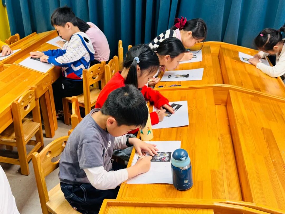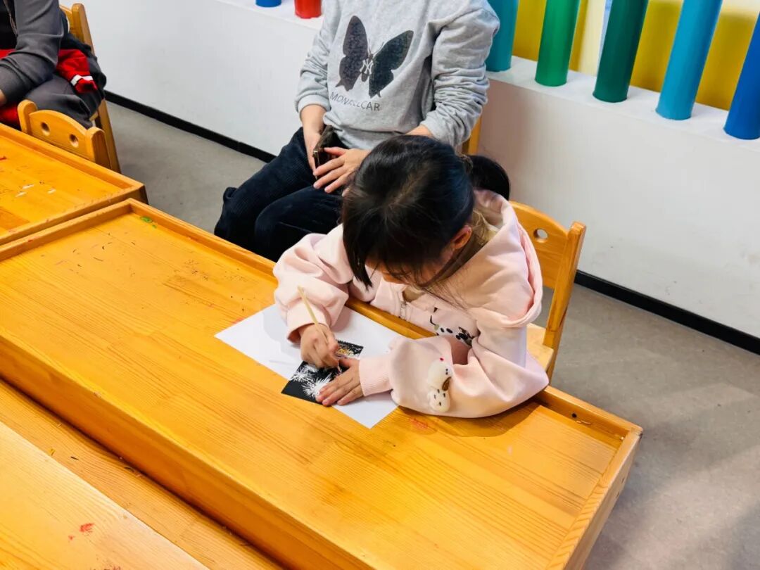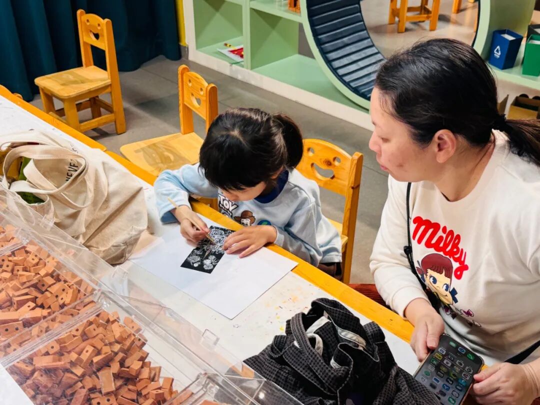 最让孩子们雀跃的环节莫过于“炫彩夜景刮刮画”创作。在文化志愿者老师的指导下,每个家庭领取了黑色刮画纸与木质刮笔。亲子携手,轻轻刮擦纸面:漆黑的“夜空”下,渐渐露出金色烟花、红色灯笼、可爱的小马造型。一时间,教室仿佛点亮了无数迷你夜景,闪耀着丙午马年的新春光彩。孩子们举着自己的作品合影,笑脸与画中的绚烂相映成趣。